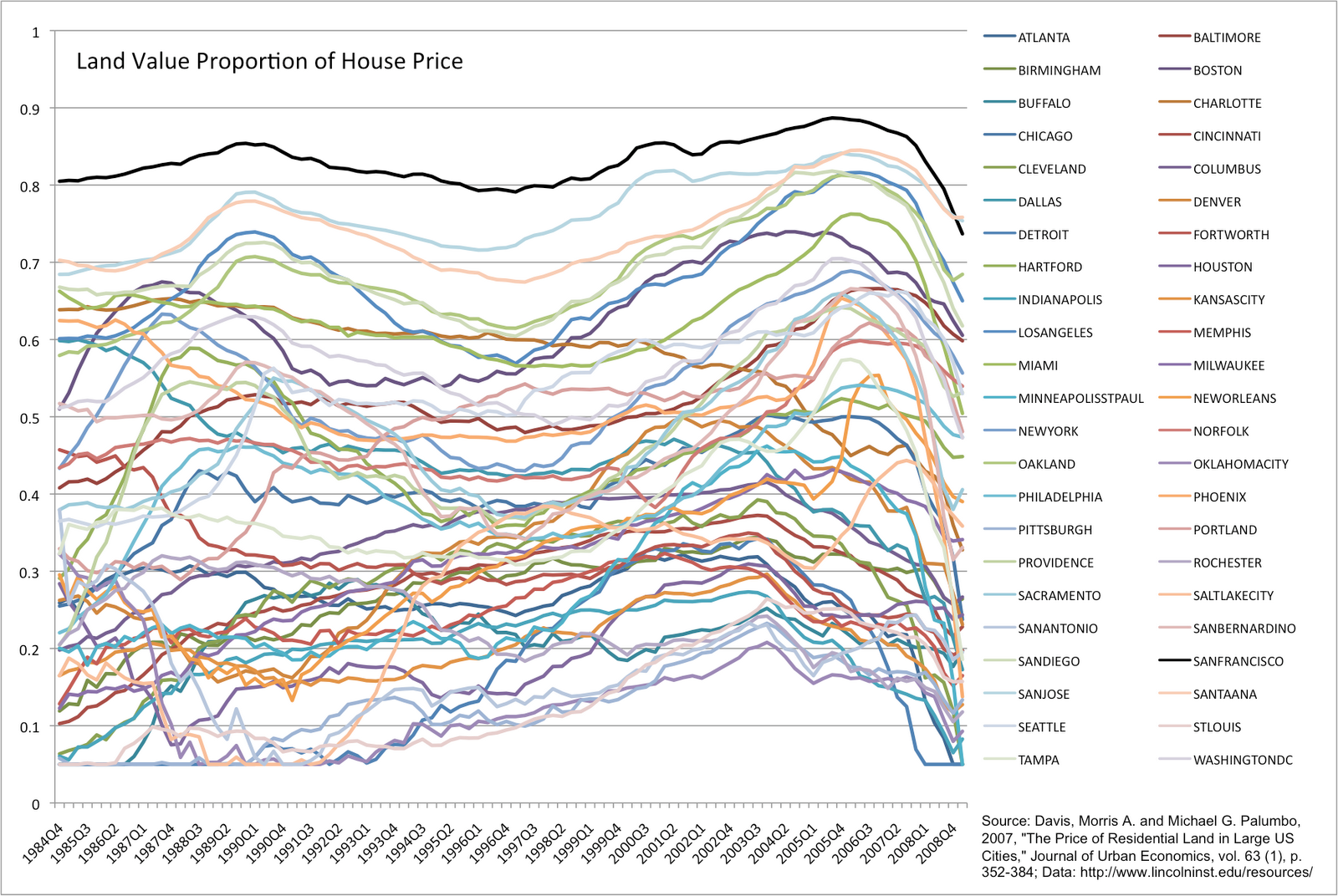 I was once more interested in r.e. prices, and wanted to see whether land in constrained areas (e.g. san francisco) was a greater proportion of the house price than land in unconstrained areas (e.g. phoenix). It is, but over time, that proportion doesn’t trend up. You do not see share of land –> 1 in any market. If the share of land is a measure of the inelasticity of demand for that particular location, so you would not expect it to go up over time unless the location was becoming more and more desirable relative to the unconstrained areas. This is another reason why house prices in desirable areas should not be infinite. And there is plenty of land — you could put the whole world into Texas, if it was willing to move there, and population growth is slowing.