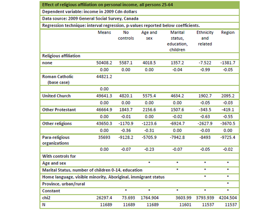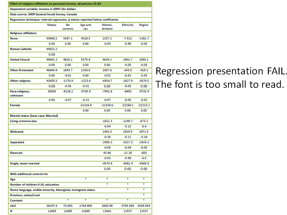 The hardest part of an empirical presentation can be figuring out the intuition behind the results. "I did a regression and this is what I got" doesn't really help. For microeconomic stories, I generally try to imagine a typical person, and think about what the results mean for them. For example, the results presented in the slides above say that a typical member of the United Church has a higher income than a typical member of the Roman Catholic church, but much of the income difference can be explained by demographic characteristics. Once controls for immigrant status, home language, visible minority and aboriginal status are added, the income premium enjoyed by members of the United Church falls from $4634.2 to $1902.7 – and we cannot ignore the possibility that there are other unmeasured demographic differences which also explain some of the remaining income differential.