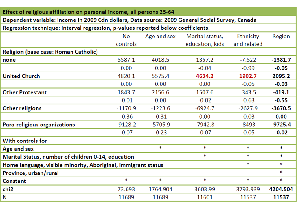 Off topic. Frances: “Once controls for immigrant status, home language, visible minority and aboriginal status are added, the income premium enjoyed by members of the United Church falls from $4634.2 to $1902.7 – and we cannot ignore the possibility that there are other unmeasured demographic differences which also explain some of the remaining income differential.”