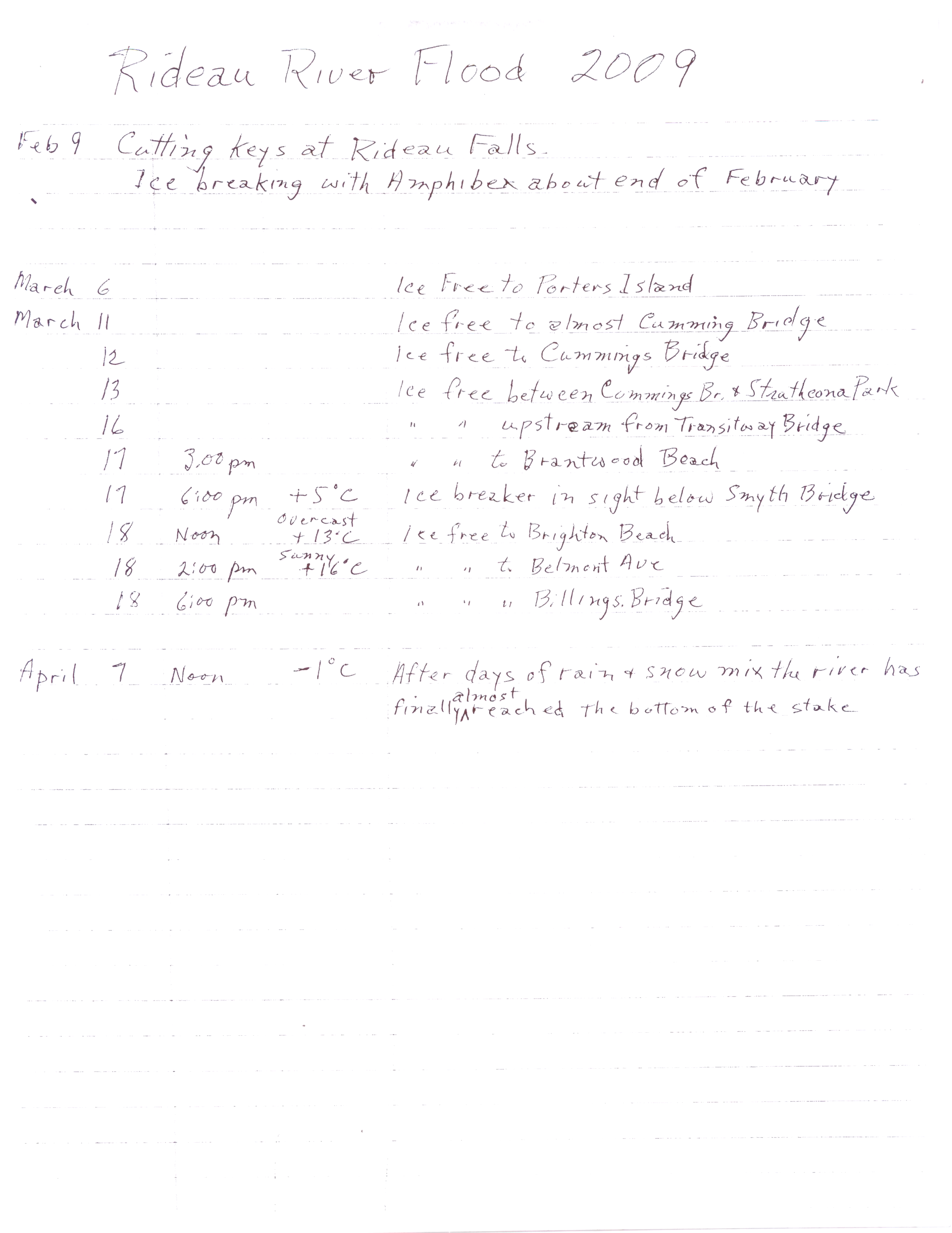 This means that the data need to be interpreted with care. It doesn’t mean that they aren’t useful. E.g. the official hydrometric data for the Rideau in Ottawa has flows going back to 1933, but the official levels data only goes back to 2002. Mr Thomson’s data has level data for specific dates back to the 1960s. There may be biases, but those biases are consistent over time – i.e. the water is measure at the same place with the same stake by the same person. One could take the Thomson data and the Environment Canada, merge the two, and get an improved estimate of the relationship between flow rates and water levels.
