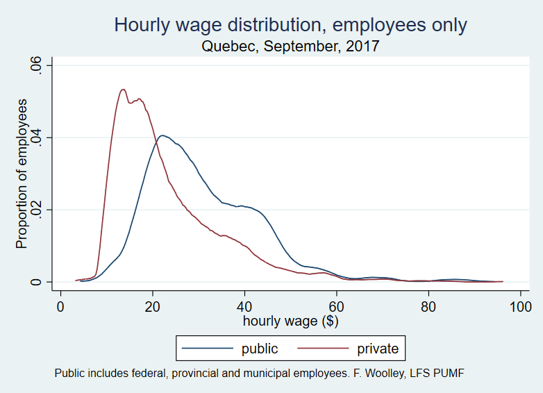 In Ontario, public sector employees earn more than private sector employees. Many workers in the private sector earn the minimum wage, or only slightly above minimum wage. The peak of the public sector earnings distribution is much higher, at twenty-something dollars per hour, and there are a good number of public sector workers earning $40 or $50 an hour.