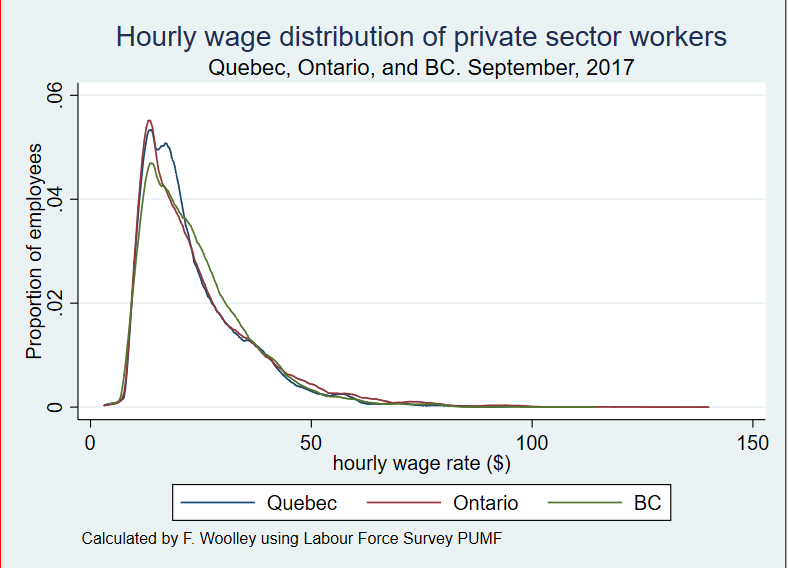 for the kernel density plot: twoway kdensity HRLYEARN if PROV==35 & COWMAIN==1 [aweight = FINALWT] || kdensity HRLYEARN if PROV==35 & COWMAIN==2 [aweight = FINALWT], title("Hourly wage distribution, employees only") subtitle("Ontario, September, 2017") ytitle("Proportion of employees") note("Calculated by F. Woolley using Labour Force Survey PUMF")