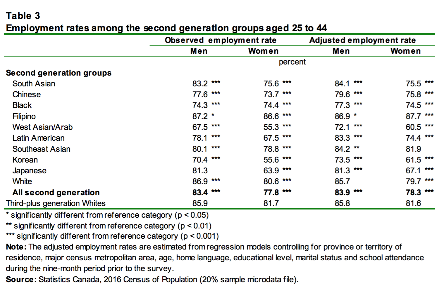 More surprising were Chen and Hou's reports of low employment rates for second generation Chinese and Korean Canadians. The employment rates for second-generation Chinese Canadian men were, according to Chen and Hou, just 77.6 percent in 2016 – 10 percentage points less than employment rate for comparable Filipino Canadians, and 9 percentage points less than the employment rate for second-generation "white" Canadians. The employment rate for second generation Chinese Canadian women is, according to their estimates, even lower: 73.7 percent.