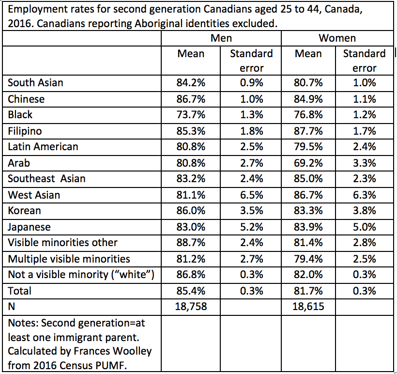 Also, if you take a narrower age range, i.e. 30 to 39, so minimizing the effects of people still being in school and the non-white population being, on average, a lot younger than the white population, several of the visible minority groups employment rates start edging above the non-visible-minority employment rate, especially for women (approx 88% employment rate for Latin American between 39 and 39, 87% employment rate for Filipino women, 86% for Chinese, v. 82% for white women).