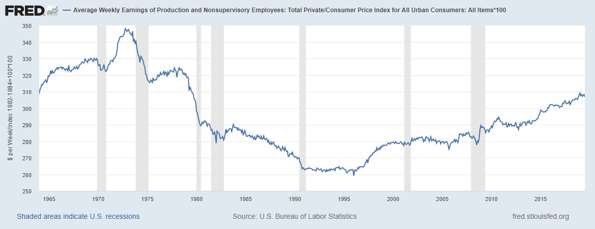 What killed the growth in real wages in the early 1970s? I've been trying to come up with an answer to this question, and I think I have one. I'm not entirely sure that it's the correct answer, but I think it's a plausible conjecture.