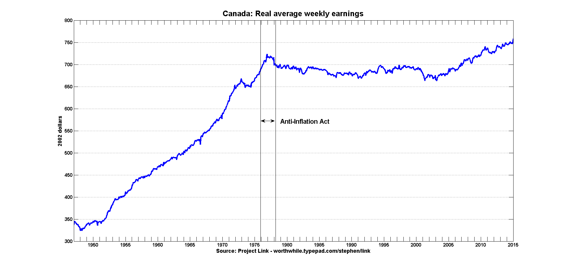 If your answer was "wage and price controls", then you are many, many months quicker on the uptake than I am. In both the US and Canada, real wage growth ended about one year after the imposition of wage and price controls. The Anti-Inflation Act was passed in December of 1974, and was in force until the period of decontrol started in April of 1978:
