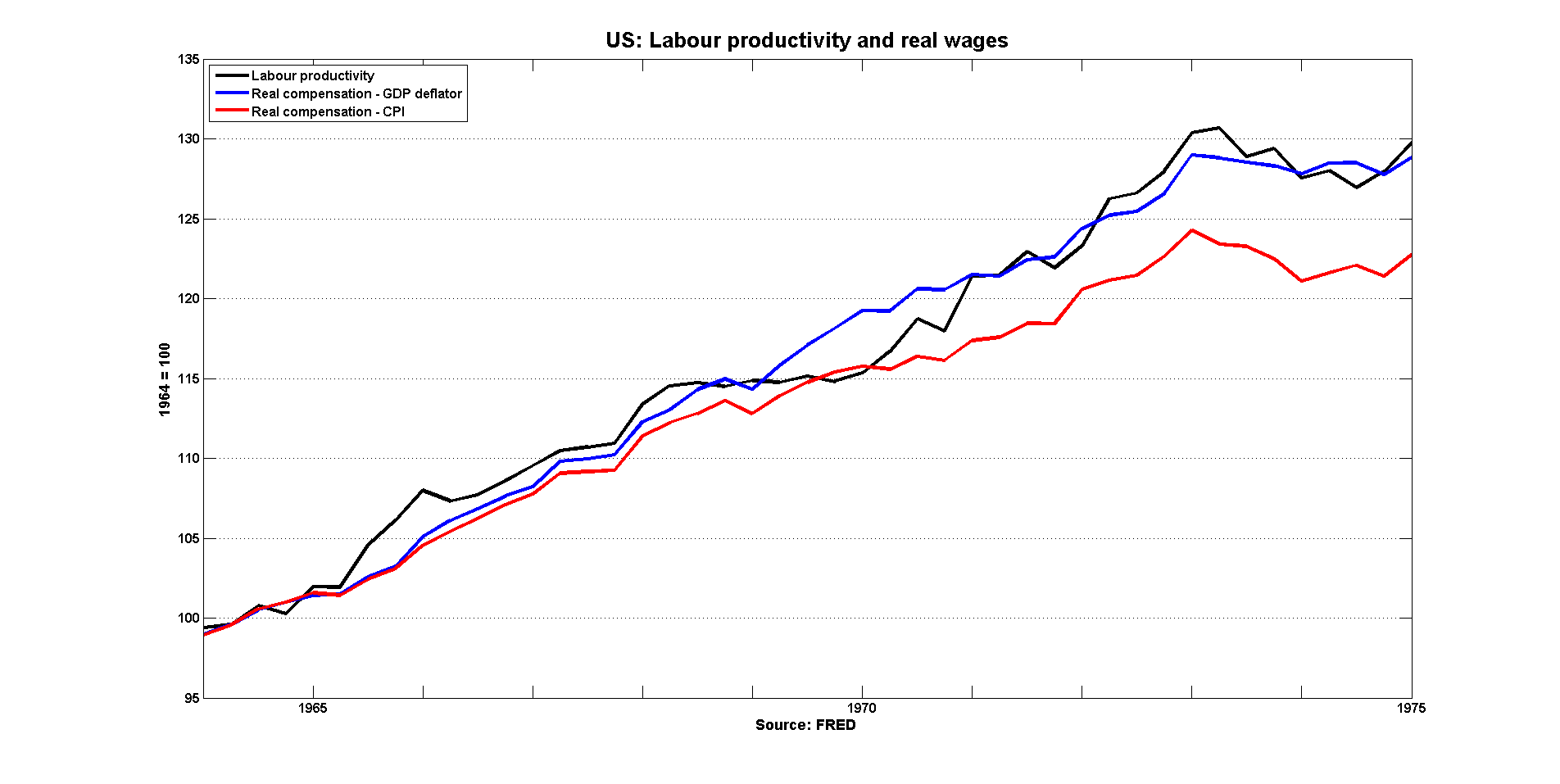 “Most of what we remember of the August 1971 Nixon shock revolves around the abandonment of Bretton Woods and its implications for the international monetary system, but the New Economic Policy also included wage and price controls until April of 1974 As it happens, David Glasner recently reposted his anniversary post on Nixon’s imposition of wage and price controls. He puts the case a little stronger than you do:Interestingly, the current (August 13th, 2011) Economist (Buttonwood column) and Forbes (Charles Kadlec op-ed) and today’s Wall Street Journal (Lewis Lehrman op-ed) mark the anniversary with critical commentaries on Nixon’s action ruefully focusing on the baleful consequences of breaking the link to gold, while barely mentioning the 90-day freeze that became the prelude to the comprehensive wage and price controls imposed after the freeze expired. Of the two events, the wage and price freeze and subsequent controls had by far the more adverse consequences, the closing of the gold window merely ratifying the demise of a gold standard that long since had ceased to function as it had for much of the 19th and early 20th centuries. In contrast to the final break with gold, no economic necessity or even a coherent economic argument on the merits lay behind the decision to impose a wage and price freeze, notwithstanding the ex-post rationalizations offered by Nixon’s economic advisers, including such estimable figures as Herbert Stein, Paul McKracken, and George Schultz, who surely knew better, but somehow were persuaded to fall into line behind a policy of massive, breathtaking, intervention into private market transactions. Glasner doesn’t make the link you do between wage and price controls and a structural break in real wage growth though. Why should the apparent effects be so long-lived? One possibility is that the imposition of controls mark a downward shift in market power of labour. It is doubtful, though, that controls were the cause of this shift. It is more plausible that they were instead the effect of a common cause, that being a downward shift in labour’s political power.”