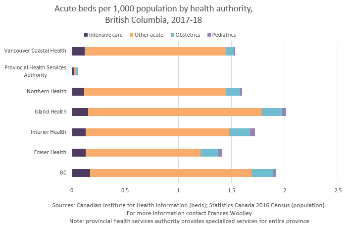 Fraser Health and Coastal Health are the two health regions that serve the Lower Mainland. Again we see this pattern of relatively low number of beds per capita in rapidly growing urban areas. Even if some of the 235 beds under the Provincial Health Service Authority were to be attributed to Fraser or Coastal health, the overall pattern would not change.