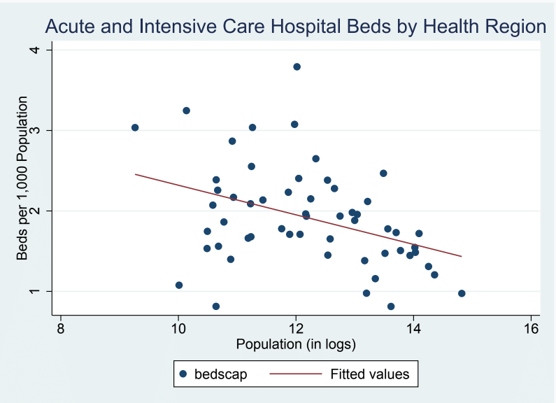 Kevin Andrew of University of Victoria also worked up some regional bed count numbers. He used a slightly different method to match population counts to health areas. His results, using Canada-wide data, finds the same inverse population/beds correlation.